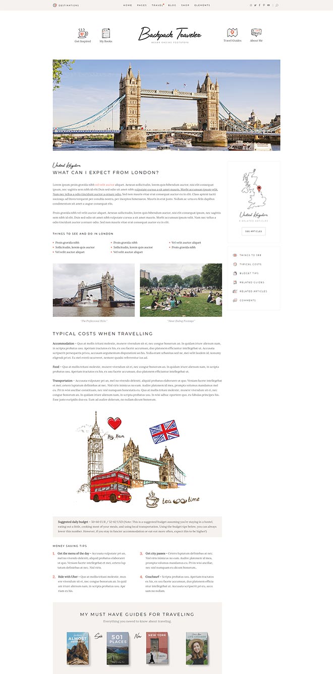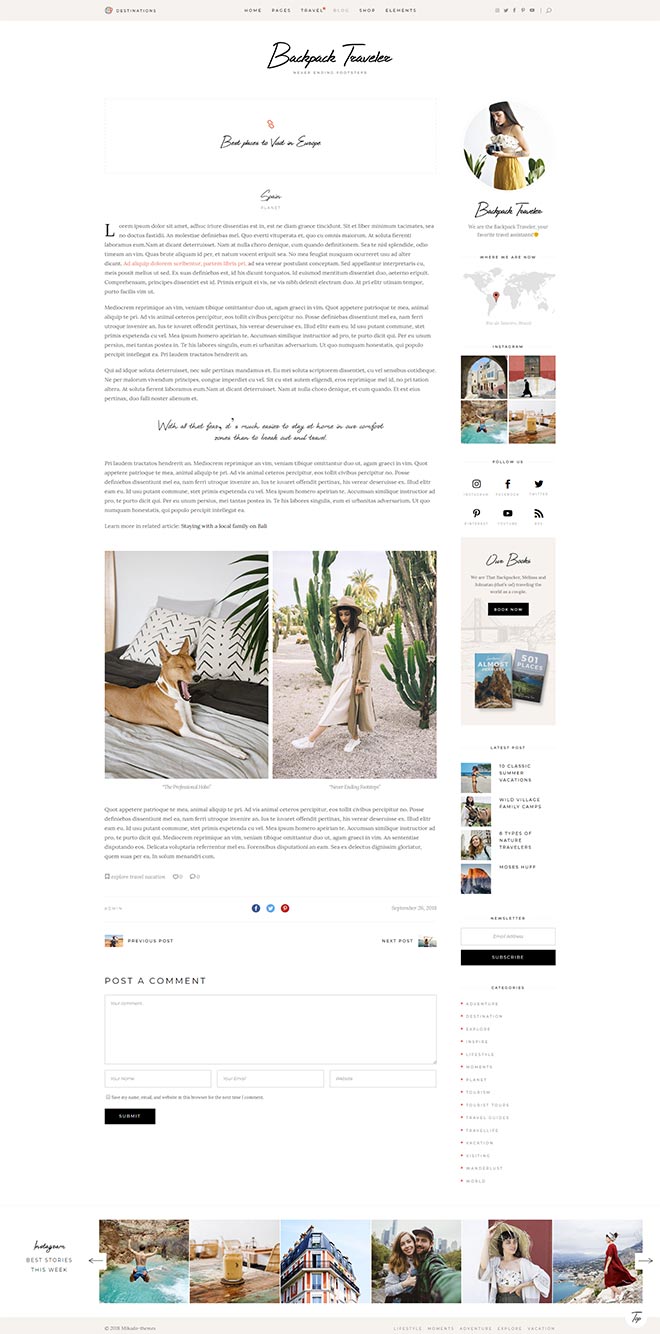 Practical Inner Pages Backpack Traveler comes with a stunning array of ready-to-use inner page, templates which are just amazing forletting everyone know about what you do & presenting yourself. You also get a destination map for highlighting all the places you visited or wrote about, as well as a contact form layout.